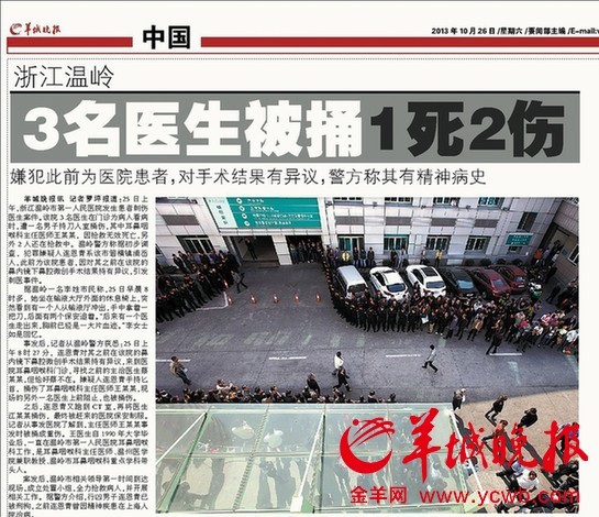 事实上,这已是10月份发生的第二起患者或者患者家属向医生行凶的事件,21日广州医科大学附属第二医院ICU内,一名患者家属因医生未能救活患者而将两名医生打伤。而据中国医院协会的一项最新调查显示,我国每所医院平均每年发生的暴力伤医事件高达27次。