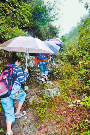 10月30日,记者在微博上看到了网友“发条”的帖子,在他贴出的照片中记者看到,天色还是一片漆黑,孩子们就背着书包出门了,他们的脚下只有窄小陡峭的山间土路,有的地方甚至几乎看不出有路的痕迹,近90度的峭壁上,只有几处窄窄的小梯坎供孩子们翻越。