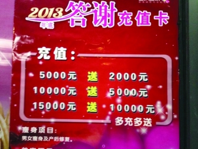 “这不是明显在圈钱骗人吗?刚刚搞充值优惠活动,没有几天就关门了!”家住西堤国际的王先生之前一直在“固本堂”消费,也办了一张会员卡,原本充值的几千元还没有花完,最近听说固本堂搞充值送消费金的活动,且优惠幅度很大,就又充值了5000元。前晚,得知“固本堂”关门的还有20多人,他们先后赶到“固本堂”看个究竟,他们在这家店里都办了VIP 充值卡,少则上千元,多则5000元甚至上万元。大家只好望门兴叹,不知道该如何去讨要卡内余额。