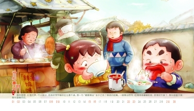 老巷口的柴火馄饨,板石道边的玉米菱角,文德桥畔的莲湖糕团,桂花树下的糖芋苗……昨日,南京代言人“南京阿槑”在新浪微博上传了一套2014年“吃货台历”,用画笔描绘了12款藏在街头巷尾的小吃,勾得众吃货网友垂涎三尺, “南京吃货必备,又让我想起了小时候南京城的故事!”扬子晚报记者王 赟