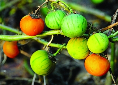 刺茄是食用茄的变异,是一种灌木,可以盆栽也可以地栽。它的叶片很漂亮,是椭圆形的,初夏开出的紫色小花还是黄色的花心哦!“它坐果和成熟时间不同。”专家解释说,“坐果”通俗地说就是植株授粉,胚珠受精,初步形成结果条件的意思。“坐果”与“结果”概念不同,前者多指早期的胚的膨大,后者多指胚发育到后期形成果实。正因为有这个时间差,整株刺茄就会显出浓绿的叶片,金黄的熟果,有一种五彩缤纷的感觉。