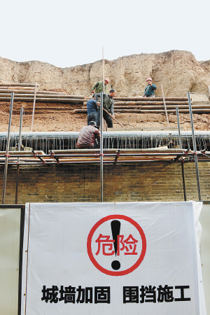昨日,工作人员正在对明秦王府城墙北段进行加固施工 记者 窦翊明 摄