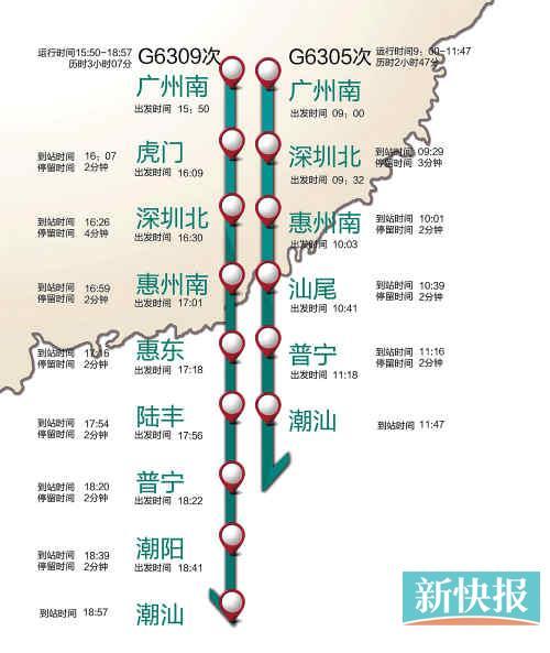 这对在广州工作生活的潮汕人来说,可直接在广州南乘坐动车直达潮汕站与深圳北站之间的共10个站点,非常方便,不过饶平站则不包括在内。由广州南至潮汕,全程407公里,二等座票价为164元,一等座票价为207元,学生票的二等座票价仅为123元。28日开通当天15时50分,G6309次将从广州南始发,于当天18时57分到达潮汕站,仅仅历时3小时7分钟。