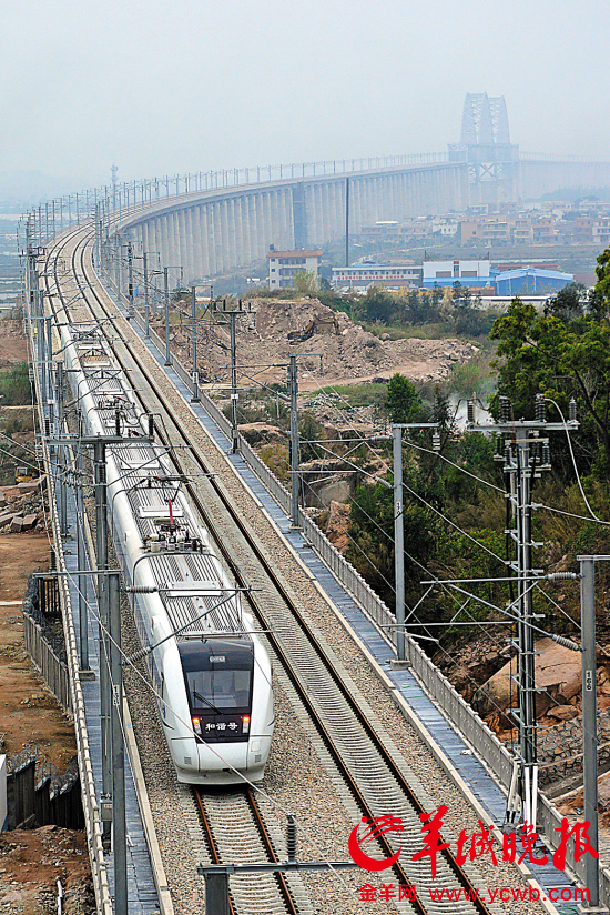 厦深铁路试运行的动车即将经过榕江特大桥 羊城晚报记者 林桂炎 摄