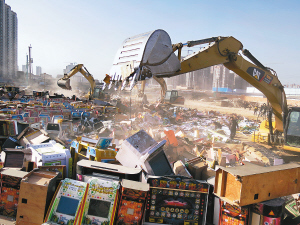 昨日,在凤城八路东段一建筑工地内,伴随着挖掘机和压路机的轰鸣声,四千余台赌博机和两万余件淫秽音像制品变成废墟。据了解,西安市集中整治娱乐场所“黄赌毒”专项行动不到两月,查获赌博机四千余台,淫秽音像制品两万余件,缴获毒品27公斤。