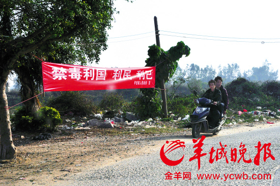 3日下午3时许,记者驱车赶到汕尾陆丰市。一进入甲子、甲西等“三甲地区”境内,“毒品一日不绝,禁毒一日不止”等醒目的宣传条幅、公益广告牌不时映入眼帘。越接近博社村,类似的横幅和标语越多。公路上设置的多个“重点整治执勤点”,正对来往车辆进行检查。