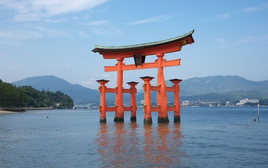 严岛神社大鸟居,高16.6米,由两根樟木制成的主柱和4根杉树制成的辅柱构成。它是于1875年重新修建的,这是自平清盛兴建以来的第八次重建。大鸟居的修建方法也很值得称道,它的上部是一个重达7吨的巨石,依靠自身的重量稳稳的立在海底的地基上。不过说到底,大鸟居也不过只是被看做是代表神域入口的一道门。