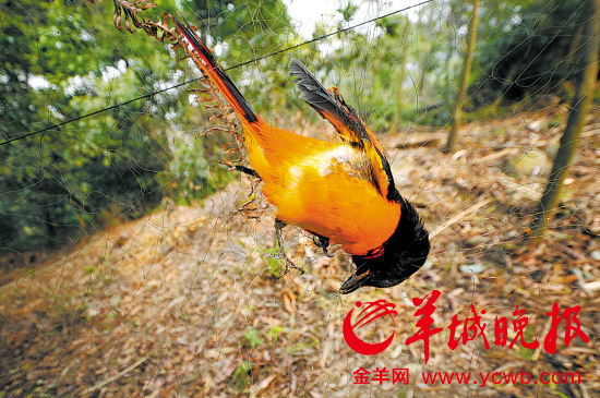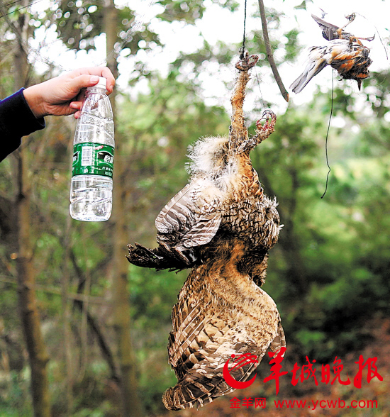 上星期,有市民报料称,在肇庆市羚羊山一面山坡上,密密麻麻拉满了捕鸟网。记者日前在现场看到,捕鸟网上还粘住了一只逾半斤重的猫头鹰。据悉,仅去年年底,肇庆市森林公安就破获了多宗盗卖野生动物的案件,并成功解救了一批野生动物。