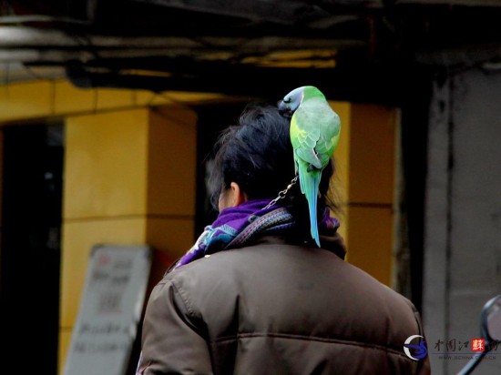 中国江苏网1月19日讯(记者 赵筱青)热心网友今天向本网爆料,称他居住的南京建宁路附近出了一只“明星鹦鹉”,与一般鸟类不同的是,这只鹦鹉每天都和主人寸步不离,不管女主人走到哪,都会站在女主人头顶上一路同行。