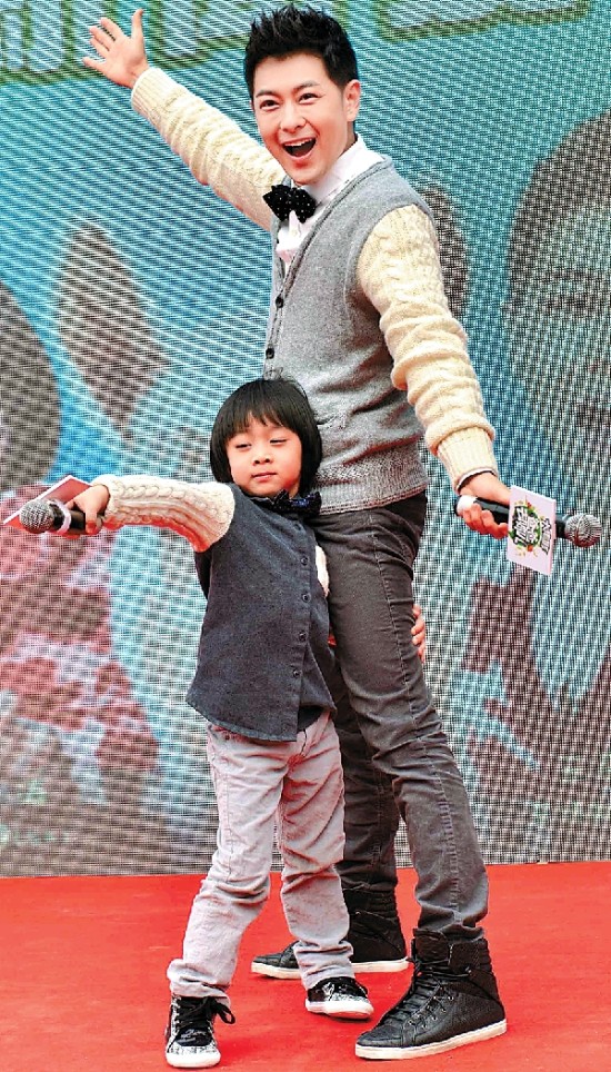 年初一公映的电影《爸爸去哪儿》,昨日到拍摄地广州长隆野生动物园宣传———林志颖和Kimi 亮相。两父子分工明确, 林志颖负责跟观众套近乎及接受记者采访,Kimi 则负责全场尖叫奔跑以及带领小观众做电影里的“给老虎BB 喂奶”游戏。