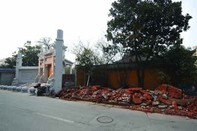 小图:此处将建一座跨河桥。大图:毗卢寺部分院墙已经开始拆除。刘浏 摄