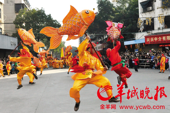 巡游队伍在潮州市中心城区的大街上进行鲤鱼舞表演,围观者众多