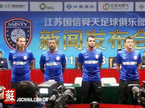 中国江苏网2月28日讯(记者 罗鹏 刘北洋)今天下午,江苏国信舜天足球俱乐部在南京召开新闻发布会,本赛季新引进的4大外援身穿2014赛季新战袍与媒体见面。其中,黑山人德扬身披10号战袍,巴西人艾利亚斯选择11号,后腰安塔尔6号,韩国球员尹信荣则身着30号球衣。