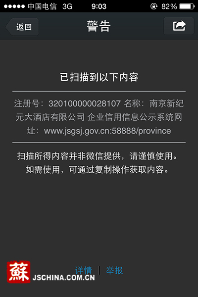 “首先,大家可以看到,新版营业执照由之前的横版改为竖版,扫描二维码可以到江苏企业信用信息公示系统,对企业信息进行查询。以后网站上还会陆续公布企业的信用信息,不单单是基础信息。”南京市工商局企业注册分局副局长徐宁说。记者随即用微信扫描了新版营业执照的二维码,很快手机上便弹出页面,显示企业的注册号及名称,以及企业信用信息公式网址,方便快捷。