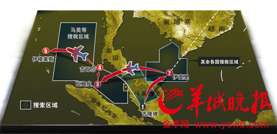 他说,马来西亚民航当局和相关的国际专家确认飞机最后与卫星失去联系的地点有两个可能的区域:一是大致从哈萨克斯坦和土库曼斯坦边境到泰国北部,二是从印度尼西亚延伸到南印度洋。