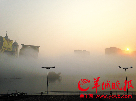 郭先生工作在澳门,平时澳门珠海两地跑,每周二四六的早晨6时半左右,无论是在珠海还是在澳门,他都要沿在海边跑上一大圈。这个习惯一直保持了近6年。他说其实清晨时海边都有些雾气,季节变化大的时候更明显一些,但今年年初至今,这些雾气变得更加严重。无论是在澳门的西湖湾和南湖湾,还是从珠海九洲港到拱北口岸,都可以看到弥漫着沉沉的雾气,而隔海对望的澳门,在雾气之中变成了宛如海市蜃楼的景象。这种现象通常持续一小时左右,等到太阳完全升起,温度也升高之后,雾气就逐渐变淡消失。