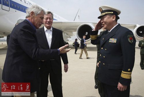 4月7日,美国国防部长哈格尔(左一)抵达青岛国际机场,中国国防部外事办公室主任关友飞海军少将(右一)到机场迎接。