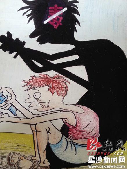 红网长沙县站4月14日讯(星沙时报记者 杨婧璜 通讯员 刘丹 粟霞)“前面是一个正在拿针管吸毒的人,我把他画成了一个衣衫褴褛、枯瘦如柴的样子,表明吸毒对人经济方面和身体方面的影响。”近日,黄花镇举办了一场“禁毒知识进校园”活动,禁毒漫画一等奖获奖者之一、黄花中学七年级的杨婧,向大家介绍她的画作。“另外,画上灯光透过吸毒者在墙上留下他的影子,从他的影子可以看到,他拿着的并不是一个简单的注射器,而是一把剑。也就是说,他实际上是在进行自杀行为。”