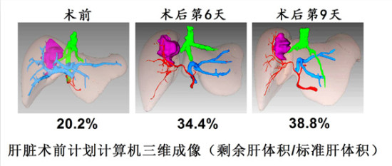 3月20日,王志明教授主刀首先为患者实施右侧肝门静脉结扎术,以此减少右侧肝的血液供应,同时将左、右半肝劈开分离,保留了左侧门静脉和左、右侧肝动脉及肝内胆管。术后第6天,经腹部CT检查,显示患者右侧肝体积因低血流量而缩小,左肝外叶体积得到快速的增长,体积达到425.6cm3,占标准肝体积的34.4%,肝功能持续平稳。3天后,再次CT检查,发现体积达到40%的“安全线”,符合开展第二次手术的安全标准。