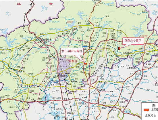 花都区选址了两处安置区,分别是保良北安置区和龙口-清布安置区。保良北安置区位于花都区花东镇保良村北,选址于S118(花都大道)以北,金谷南路以西,现代大道以东地块,距离白云国际机场约3.5km。龙口—清布安置区位于花都区花山镇龙口村与新华街清布村,选址于三东大道以南,商业大道以东地块,距离花都区政府约4.5km,至白云国际机场约2.5km。保良北安置区距离白云国际机场约3.5km。该安置区将建设55栋居民住宅楼(楼层数均为10层,设1-2层地下室),龙口—清布安置区建设31栋居民住宅楼(楼层数为12-13层,设1-2层地下室)。