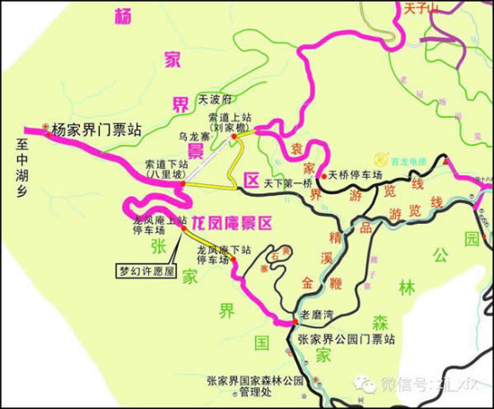 杨家界索道上站位于八里坡游览线刘家檐,下站位于中湖乡野溪铺村,设计采用单线循环脱挂抱索器八人车厢式索道,最高运行速度6m/s,最大运力为2300人/小时,单程运行时间5.2分钟,是目前世界上最先进的客运观光索道。