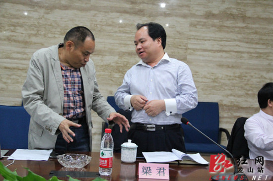 (签约前,龙山县委副书记、县长梁君和吴献成总经理交谈。)