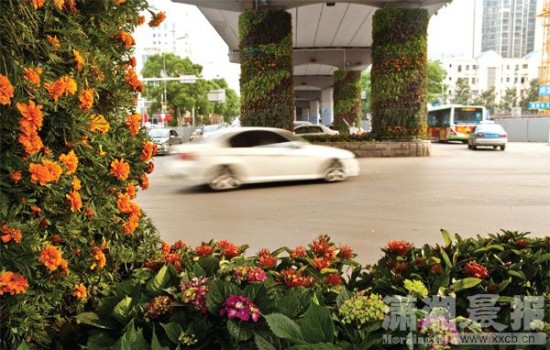 现在经过东塘立交桥,你会发现,墙面、桥墩、桥上花箱、桥下停车场棚架都种满了植物。灰色的水泥桥梁,如今仿佛穿了一件花衣裳。