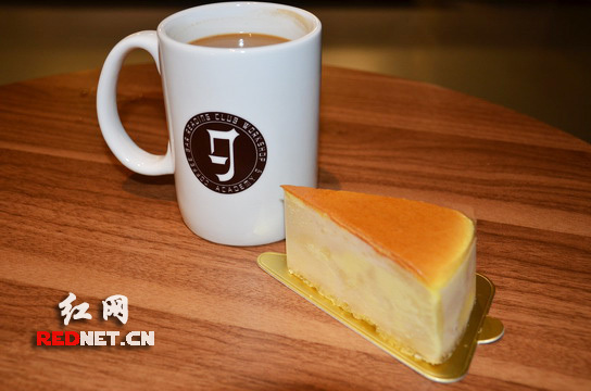 (印有书院九号LOGO的咖啡杯,盛着的是九号特调咖啡,搭配原味芝士)