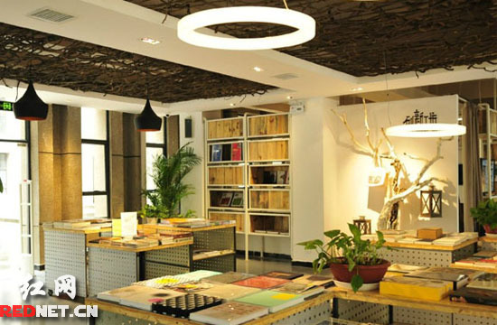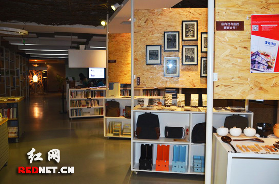 入口处的创新工坊摆放的都是一些具有个性的物件,由店家从各处精心搜集而来。同时还有两个展柜专门用来展示设计艺术学院学生的创意文化产品,让学生充分发挥自己的特长,立足本土,以“湖湘文化”和“岳麓书院”为设计主题。