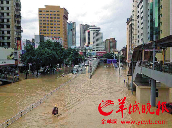 当天上午11时左右,暴雨倾泻惠州,仅一个多小时,地势较平的惠州学院水浸,在校门口低洼地区小车几乎不能通过。东湖片区的威尼斯小区成了名副其实的威尼斯,车辆无法通过。江北新区是惠州的CBD中心地带,在华茂中心附近,一辆红色宝马试图冲过深水区,结果半途死火。华茂对面的小区江畔花园一片汪洋,此地曾被淹多次,车库曾经遭遇“灭顶之灾”,这次该小区再次被淹。在江南上排老区汽车总站附近,由于是低洼地区,此次更是成为重灾区,大批车辆来不及撤离,车主眼看着车子被水淹没。因洪水围困,惠州汽车总站多班次被取消。