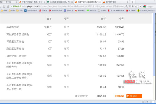 (网友邹先生在中国平安保险官网上计算保费,发现今年的商业险比去年多出915.62元。)