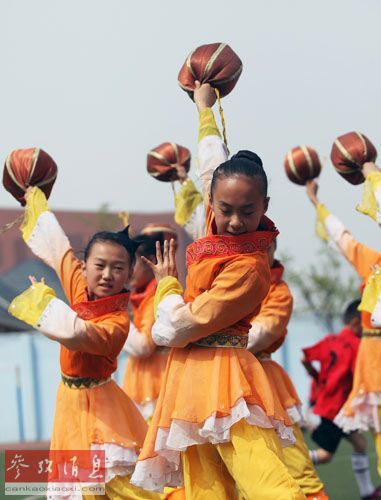 资料图片:2014年4月2日,淄博市临淄区晏婴小学的学生在练习蹴鞠舞。(新华社记者崔立来 摄)