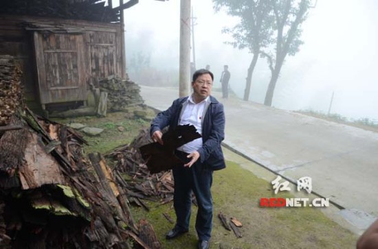(5月22日,沿溪乡三渡水村。蒙汉拿起村民向吉声家换下的杉树皮“瓦片”感叹,山上的群众生活不易。)