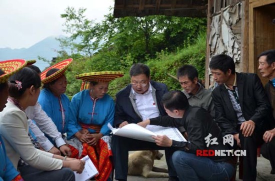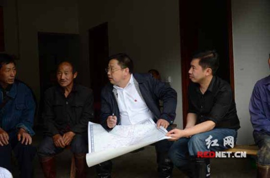 (5月22日,舒溶溪乡火炉溪村,溆浦县委书记蒙汉(中)与当地村民一起讨论断头路施工的方案。)