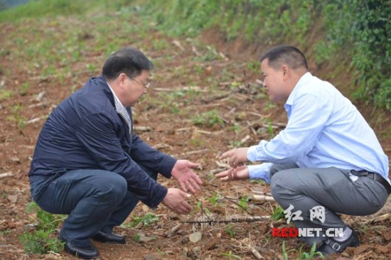 (5月22日,沿溪乡,蒙汉(左)与君健药材合作社理事长王依清在黄柏种植基地里参观。)