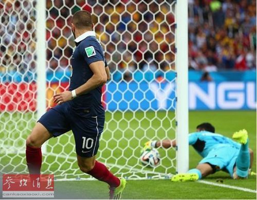 此前,法国队球员本泽马射门击中门柱,洪都拉斯队守门员巴利亚达雷斯的左手把沿球门线滚动的足球碰进了球门,随后他又将球捞出。