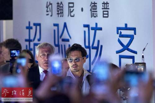 约翰尼·德普(右一)3月31日在北京参加《超验骇客》的宣传活动,粉丝们纷纷用手机拍照。
