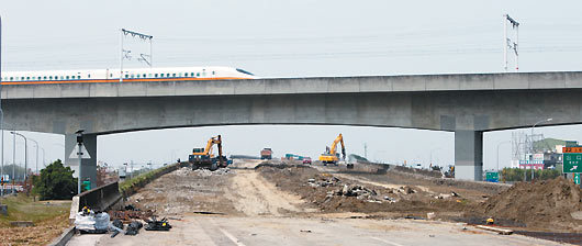 台78线快速道路土堤路基对跨交的高铁墩柱负荷沉重,恶化墩柱倾斜,“公路总局”正挖除路基改建高架钢桥为高铁减重。