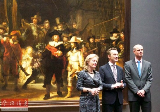 资料图片:在荷兰国立博物馆举行的媒体活动上,荷兰教育、文化和科学部长耶特·比塞马克女士(左)等站在伦勃朗名作《夜巡》前接受采访。新华社发(西尔维亚·莱德尔摄)