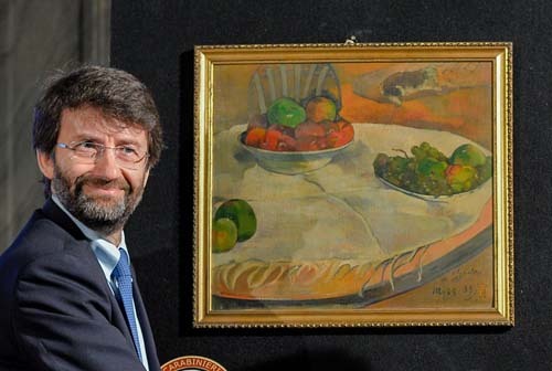 意文化部长弗兰切斯基尼向记者展示高更画作《桌上的水果和小狗》(法新社)