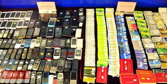 资料图片:广东警方在某次打击电信诈骗及银行卡犯罪专项行动中查获的手机和银行卡等涉案物品。新华社记者-黄国保-摄