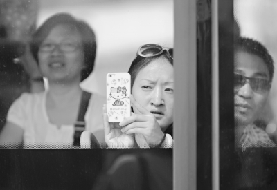 9日下午,与嫌犯搭乘同一航班的旅客对天河机场押解31名嫌犯的场面颇感好奇,用手机拍照 见习记者 郭良朔 摄(信息来源:应后威 实习生:于桐)