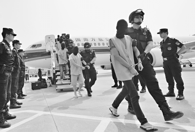 15时20分,2名全副武装的特警押解第一名嫌犯走出机舱门。嫌犯身穿黄色马甲,戴着手铐和头套被押下飞机,身后跟着另7名嫌犯,被送上特警中巴车。10分钟内,31名嫌犯分多次被押下飞机送上车。记者看到,这31名嫌犯中,男女几乎各占一半。
