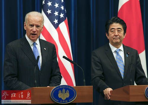 资料图片:12月3日,在日本东京,日本首相安倍晋三(右)与美国副总统拜登出席联合记者会。新华社发