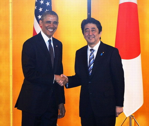 24日上午,日本首相安倍晋三(右)和美国总统奥巴马举行首脑会谈(网页截图)