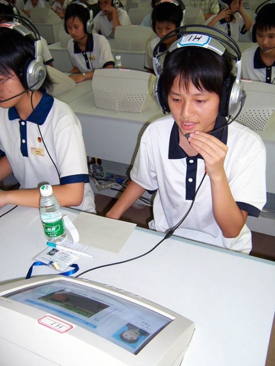 资料图片:广东省湛江市中考考生在指定考场内进行“人机对话”,测试普通话和英语口语水平。
