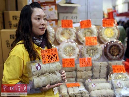 资料图片:2013年12月25日,工作人员在香港冬日美食节上向顾客推介泰国燕窝。当日,为期4天的香港