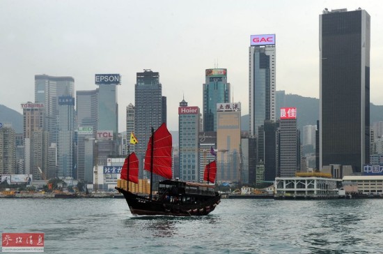 资料图片:香港仅存的一批中式帆船中的Aqua Luna号驶过香港天际线。