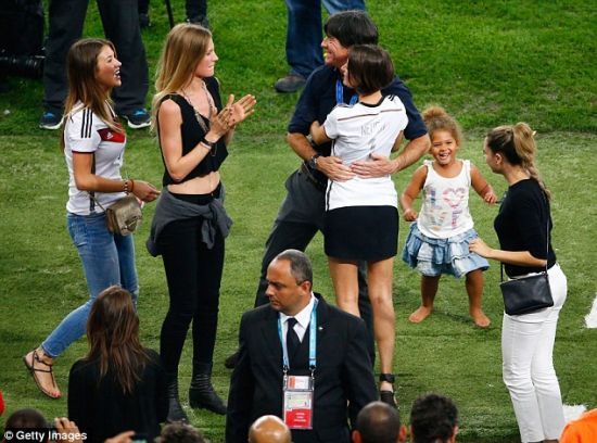 德国太太团还不忘一一拥抱球队主教练勒夫,感谢着勒夫。团结的德意志,从他们太太身上或许就能看到冠军的影子。