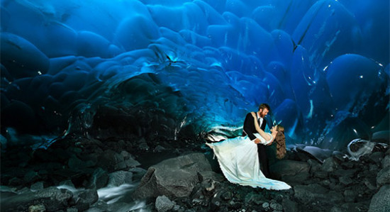 情侣在阿拉斯加冰洞拍摄结婚照